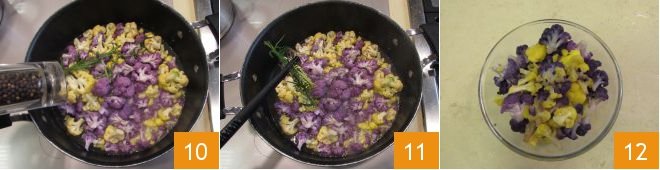 Don't forget to adjust salt and pepper 10 and remove the sprig of rosemary at the end of cooking 11. Without discarding the cooking base, transfer the cooked florets to a container and set them aside 12.