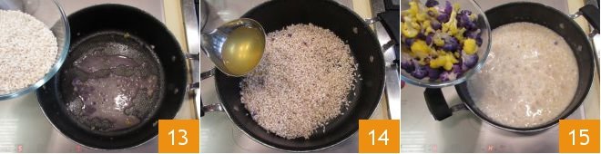In the same saucepan, pour in the rice 13 and let it toast for a few minutes, stirring continuously. When it's ready, moisten it with the hot broth 14 and cook by stirring from time to time; adjust salt and pepper to taste. A couple of minutes before the end of cooking, add the florets 15