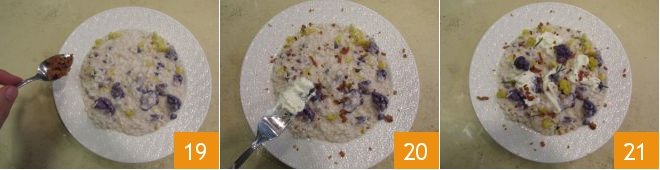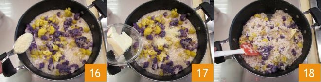 and finish by stirring. Then turn off the heat and add the grated cheese 16 and the remaining butter 17. Mix well and proceed with plating 18.