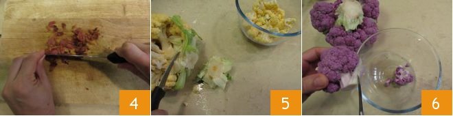 When it's ready, finely chop the guanciale with a knife to obtain the crumbs 4. Move on to the cauliflowers. Immediately remove the stalks 5 and plunge them into a pot with plenty of water, the carrot, the onion, and coarse salt, and let them simmer for about half an hour, thus obtaining the vegetable broth that you will need for cooking the rice. Meanwhile, while the broth is cooking, clean the two cauliflowers by obtaining the florets 6.