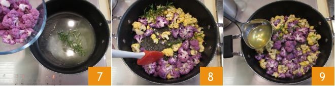 Rinse them under a stream of cold water and proceed with cooking. In a saucepan, melt 2 tablespoons of butter and add a sprig of rosemary for flavor. Then, in the hot base, pour in the florets of the purple and yellow cauliflower 7. Cook for about ten minutes, stirring gently from time to time 8 and using a few ladles of broth to help 9.