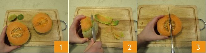 To prepare the risotto with ham and melon, start by removing both ends of the melon and cut it in half 1. Use a knife to remove the outer skin 2 and divide each half into 2 equal parts again 3.