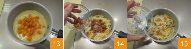 When almost cooked, add the melon 13 and ham 14, reserving a few pieces for the final decoration, and mix everything. Once the risotto is cooked, remove it from the heat and add the stracciatella to cream it 15, continuing to stir until it melts, to obtain a creamy risotto.