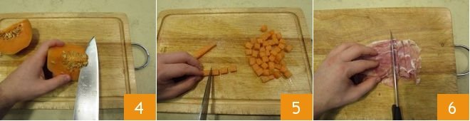 Remove the inner part with the seeds 4 and cut it into slices not too thick, then dice them into about half-inch cubes 5. Set aside, and in the meantime, take the ham and slice it into strips about half an inch thick 6.