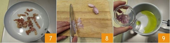 Let them brown in a non-stick pan for a few minutes without adding oil 7: as soon as a light crust forms on the surface, they will be ready. Now finely chop the shallot 8. Place it in a large pan and sauté it with a drizzle of oil 9.