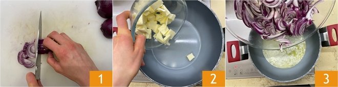 To prepare risotto with onion cream and hazelnuts, first prepare the Vegetable broth and keep it warm. Clean and slice the red onions 1. In a hot pot, add the diced butter 2. Once melted, add the onions 3.