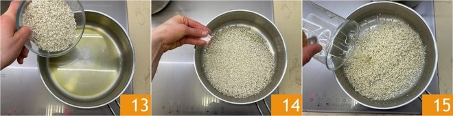 Add the rice 13 and season with salt 14. Once the rice is well toasted and hot, deglaze with white wine 15 and let it evaporate.
