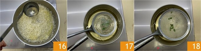 Cook for 10 minutes, adding the broth little by little; always ensure the liquid is boiling and that the previous amount has been absorbed 16. Meanwhile, fry the sage leaves briefly in hot seed oil at 340°F 17, just long enough to make them crispy, then drain them 18.