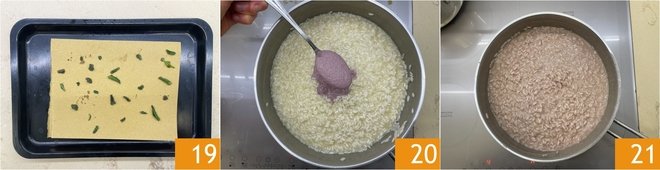 Place them on a tray lined with paper towels to absorb the oil 19 and set aside. After 10 minutes of cooking the rice, add the onion cream to the saucepan 20 and continue cooking for another 2 minutes. Turn off the heat 21.