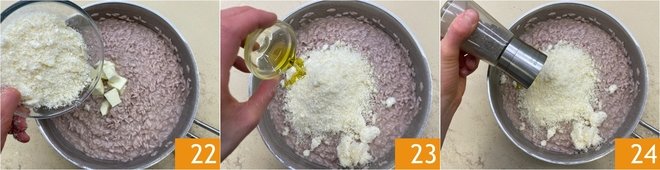 Cream with grated Parmigiano Reggiano, cold butter 22, and oil 23. Finally, add pepper to taste 24.