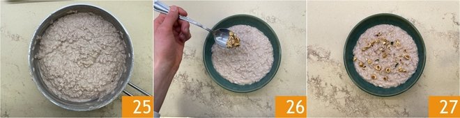 Stir vigorously, then let it rest for a minute 25. Plate the risotto, garnishing with toasted and coarsely chopped hazelnuts 26 and the fried sage leaves. The risotto with onion cream and hazelnuts is ready to be served 27!