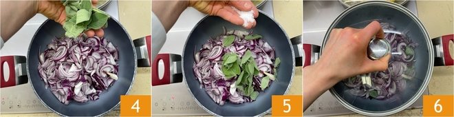 Add the sage leaves 4, season with salt 5 and pepper, and cook covered for 15 minutes on medium-low heat, stirring occasionally 6.