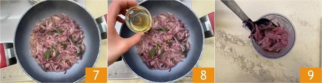 The onions should be soft and dry 7. Deglaze with white wine vinegar 8 and let it evaporate, then transfer the onions to a jug 9.
