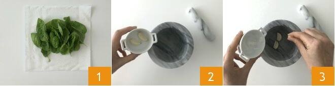 To prepare the potato and pesto risotto, make the pesto: clean the basil leaves with some kitchen paper 1, place two peeled garlic cloves without the germ inside the mortar 2, add a pinch of salt 3