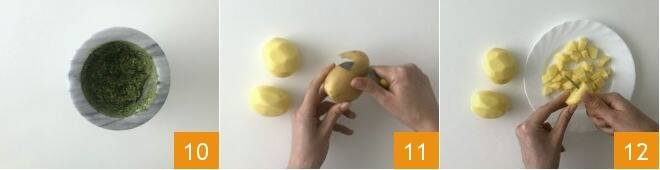 and the pesto is ready 10. Peel the potatoes 11 and cut them into cubes 12.