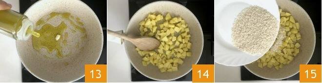 In a pan, add a whole peeled garlic clove, the oil 13, and brown the clove. Remove the garlic and add the potatoes 14, let them brown for a few seconds, and then add the rice 15,