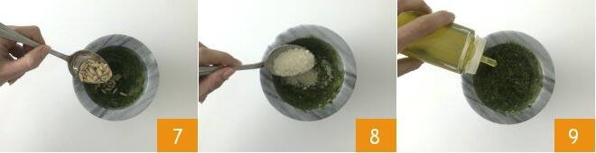 Add the pine nuts 7, crush them, and then add the grated Parmesan 8. Finally, pour in the oil 9