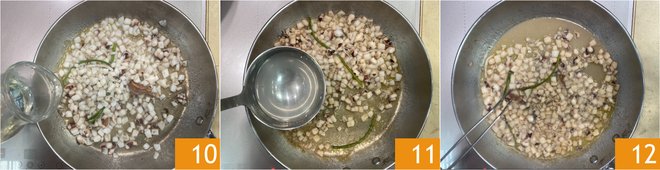 In a pan, flavor a swirl of oil with the crushed garlic clove and the parsley stalks 7, then add the cuttlefish 8 and brown them, stirring 9.