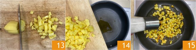 While the cuttlefish are cooking, peel the potatoes and cut them into cubes 13. Pour the potatoes into another pan with a drizzle of hot oil 14 and brown them until golden with a pinch of salt 15.