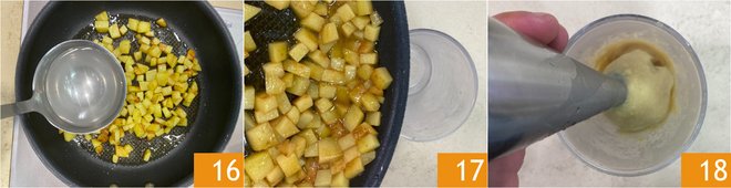 Moisten with a ladle of hot water 16 and cook for a few more minutes. Transfer the potatoes to a jug 17 and blend with an immersion mixer to obtain a cream 18.