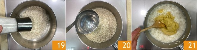 Move on to the rice: dry-toast the rice in a saucepan with a pinch of salt 19, then cook it for about 12 minutes, adding a ladle of hot water at a time 20. During the last few minutes of cooking, add the potato cream 21.