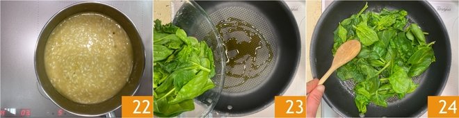 Mix well and finish cooking the risotto 22. Meanwhile, put the baby spinach in the same pan as the potatoes with a drizzle of oil 23 and sauté briefly, just enough time to wilt it 24. Lightly salt.