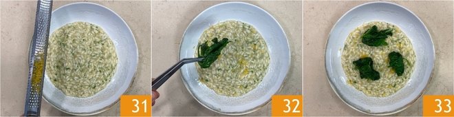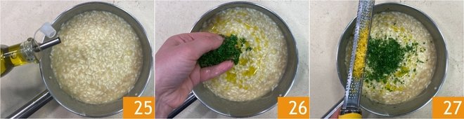 When the risotto is cooked, remove it from the heat and stir in a drizzle of oil 25, then season with chopped parsley leaves 26 and grated lemon zest 27. If necessary, you can also add a little hot water to make it creamier.