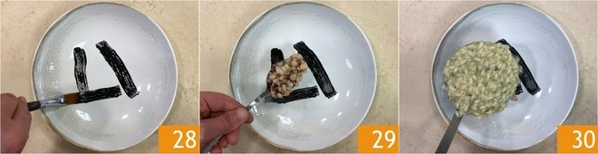 You are ready to plate: brush the plate with cuttlefish ink 28, then add a couple of spoonfuls of cuttlefish ragout 29 and cover with the risotto 30.