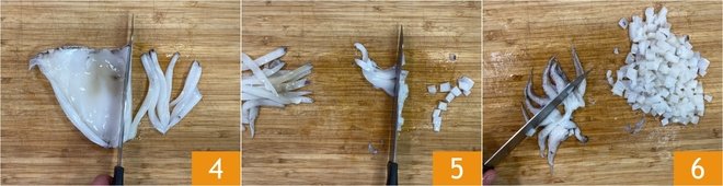 Cut the cuttlefish first into strips 4 and then into small cubes 5. Also cut the tentacles into cubes 6. Bring a pot of water to a boil and keep it warm: you will need it to cook the different preparations.