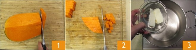 To prepare the risotto with pumpkin, chestnuts, and gorgonzola, the first thing to do is to cut the Neapolitan pumpkin into slices about 0.4 inches thick 1. Remove the skin and cut into cubes about 0.4 inches large 2. In a pot, heat some water that will be used for cooking the risotto. Melt 5 tablespoons of butter in a pot 3.