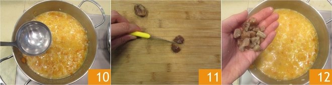 Cook the rice by adding more hot water as needed 10 and stirring occasionally. Meanwhile, cut the chestnuts into small pieces 11 and add them when the rice is cooked 12.