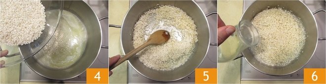 Once melted, add the rice 4 and toast it for a few minutes on medium heat, stirring occasionally 5. Deglaze with white wine 6, stir, and let it evaporate completely.