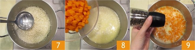 Add the now hot water until it covers the rice 7. Add the pumpkin 8, a pinch of salt, and pepper 9.