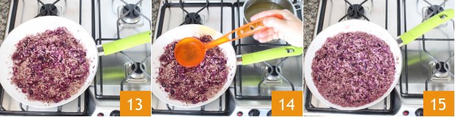 Proceed to cooking the rice. Pour it into the pan with the cabbage 10 and toast it for 3 minutes, stirring with a ladle for 3 minutes 11. Then pour in the red wine 12