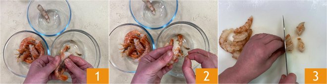 To prepare the risotto with red lentils and shrimp, first focus on the How to clean shrimp. Remove the head, shell 1, and intestine 2, then cut them into 3 pieces 3.
