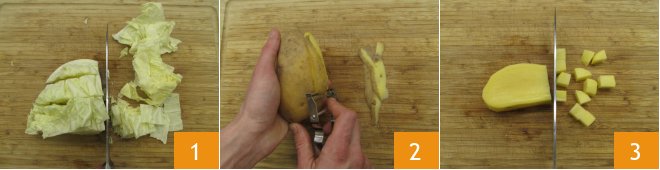 To prepare the risotto with savoy cabbage and potatoes, start with the cabbage. After removing the stalk, cut it into 1.25-inch pieces 1. Then move on to the potatoes, peel them 2 and cut into 0.5-inch cubes 3.