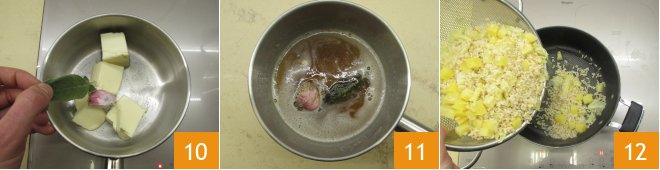 In the meantime, prepare the seasoning. Crush an unpeeled garlic clove and throw it into a small pan with the butter and sage 10. Let it heat over low heat until the butter is melted and aromatic 11. Now that everything is ready, drizzle some oil in a pan and pour in the rice with potatoes and cabbage 12.
