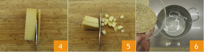 Finally, remove the rind from the Valtellina Casera cheese 4 and cut into cubes of about 0.5 inches 5. Now move to the stove. In a pot of boiling salted water, pour the brown rice 6,