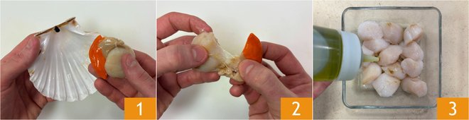 To prepare the risotto with scallops and citrus, first, release the fruit from the shell 1, separate the coral from the nut 2 and set aside. Place the nuts in a bowl and season with oil 3.