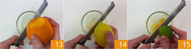 Grate the zest of the orange 13, lemon 14, and lime 15.