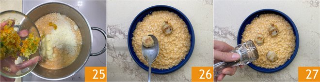 Add also the citrus zests 25 and stir. Plate, place the scallops on top of the risotto 26, and add a sprinkle of black pepper 27.