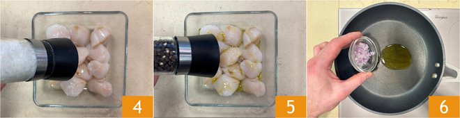Extract the juice of the orange 16 and the lemon 17. Heat a non-stick pan well and cook the scallops for 30 seconds on each side 18.