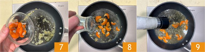 Add the corals 7, pour a glass of water 8, and cook for a minute. Adjust with salt 9.