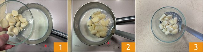 To prepare the risotto with turnip tops, anchovies, and garlic sauce, first peel the garlic cloves. Pour 5 oz (150 g) of milk into a small saucepan, add the garlic 1, and bring to a boil. Drain with a slotted spoon 2 and place the garlic in a small bowl 3. Discard the boiled milk and pour another 5 oz (150 g) of milk, repeating the same process 3 more times.