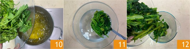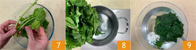 Clean the turnip greens, separating the tops from the leaves 7. Blanch the leaves in boiling salted water for a few minutes 8, then drain and cool in ice water 9.