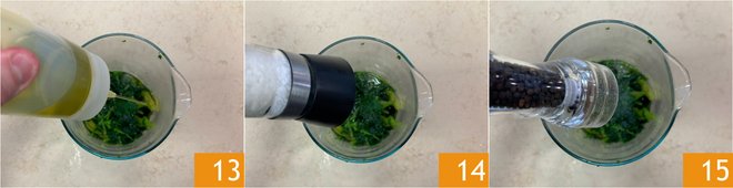 Add the oil 13, then adjust with salt and pepper 14 15.