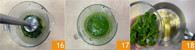 Blend 16 until you obtain a smooth and homogeneous sauce 17. In a pan, pour the oil and add the turnip tops 18.