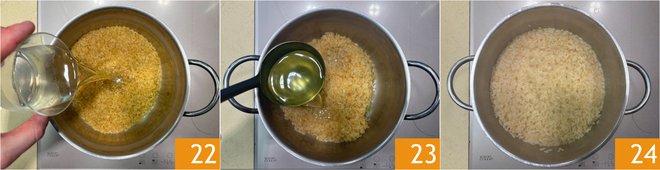 Deglaze with white wine 22 and let all the alcohol evaporate, then cover with hot cooking water 23 until the rice is submerged by about an inch; it will take about 1 quart of liquid. Cook the rice, keeping it quite dry 24.