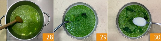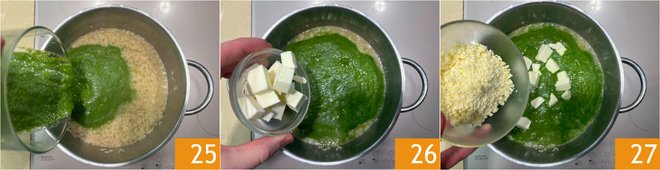 Turn off the heat and add the turnip top sauce 25, then stir in the cold butter in pieces 26 and the Parmesan cheese 27.