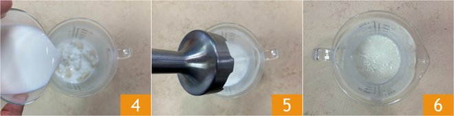At the end of this process, transfer the garlic cloves to a pitcher along with 1.7 oz (50 g) of milk 4, then blend 5 until you obtain a silky sauce 6. Cover with plastic wrap and keep in the refrigerator until ready to use.
